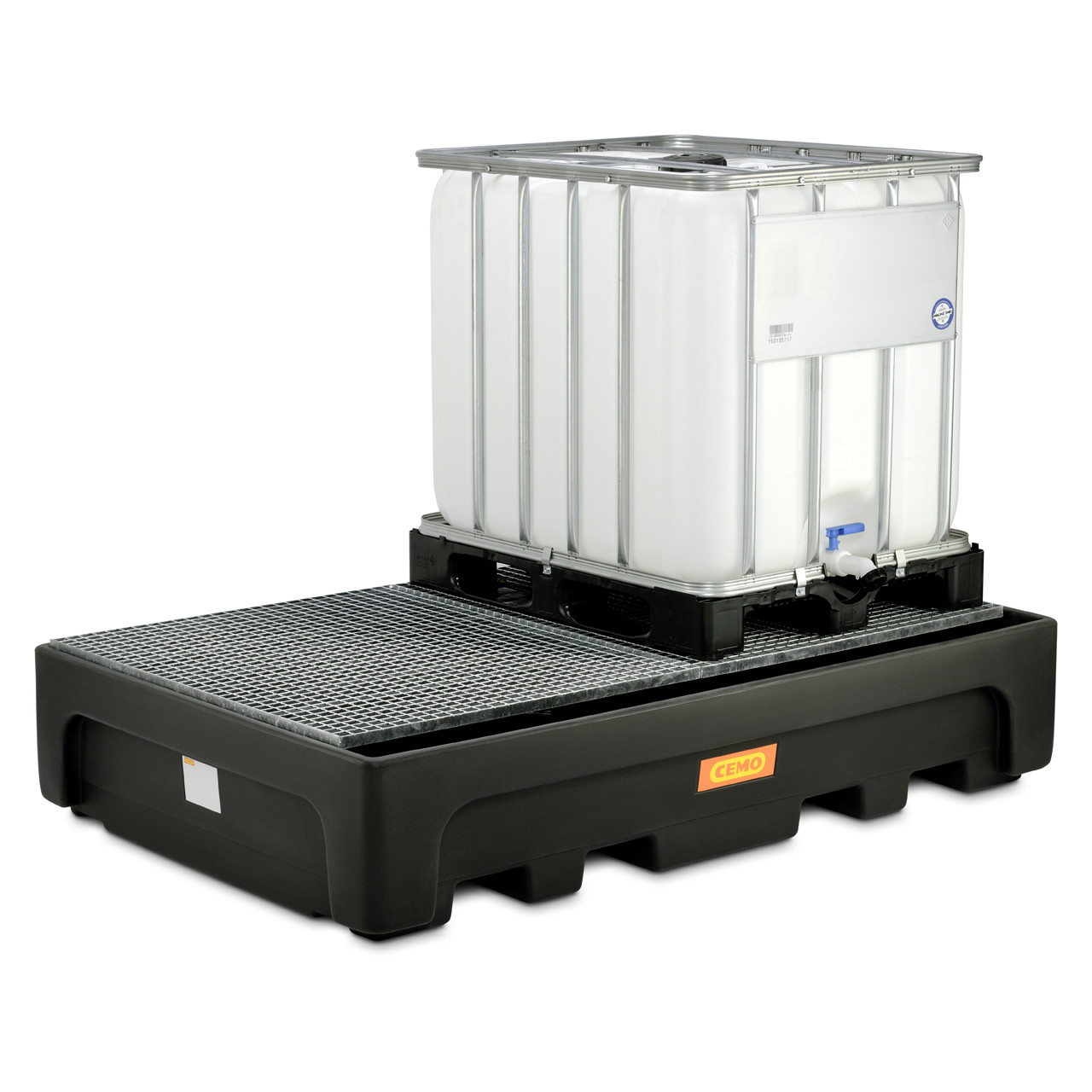 Als Aufstellfläche dienen zwei stabile PE-Stützkreuze, wodurch die 1000 Liter IBCs sicher und stabil stehen. Optional können zusätzlich verzinkte Stahlgitterroste oder PE-Lochplatten verwendet werden. Hier bietet sich die Möglichkeit auch andere Gebindegrößen oder Fässer zu lagern. Ein weiterer Vorteil ist, dass die Auffangwanne 2-seitig unterfahrbar ist, wodurch ein Umsetzen im leeren Zustand jederzeit möglich ist.