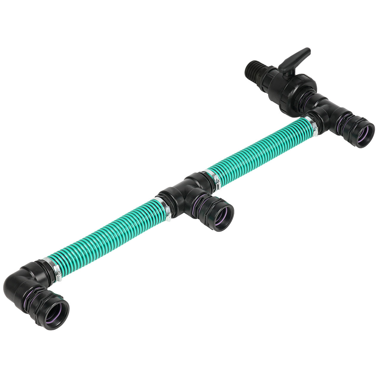 Mit der IBC Schlauch Tankverbindung können Sie 3 IBC Container mit einen IBC Hahnausgang BSP 2'' Feingewinde* nebeneinander verbinden.